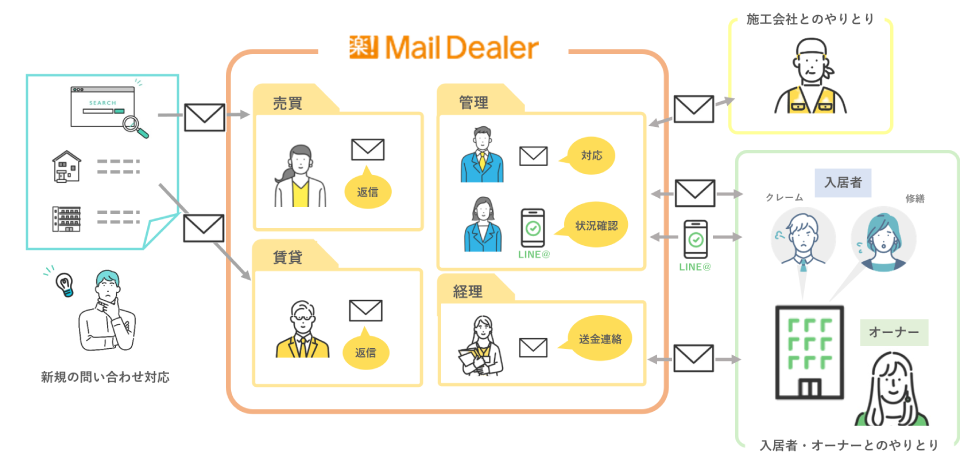 そういった事業内容から、売買、管理、賃貸、それらの送金や契約関係を管理する経理、物件のオーナー対応と業務が大きく5つに分かれており、全業務でメールディーラーを利用しています。