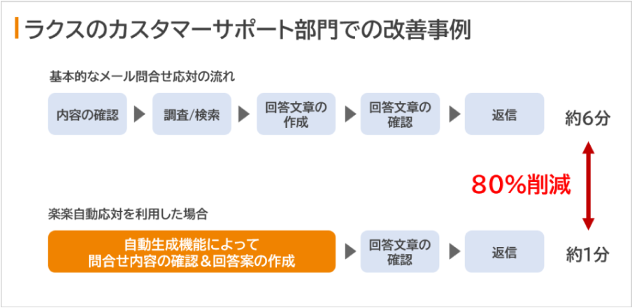 「楽楽自動応対」は、のAI機能(自動生成)を活用することで、問い合わせ応対にかかる時間を大幅に短縮することができます。