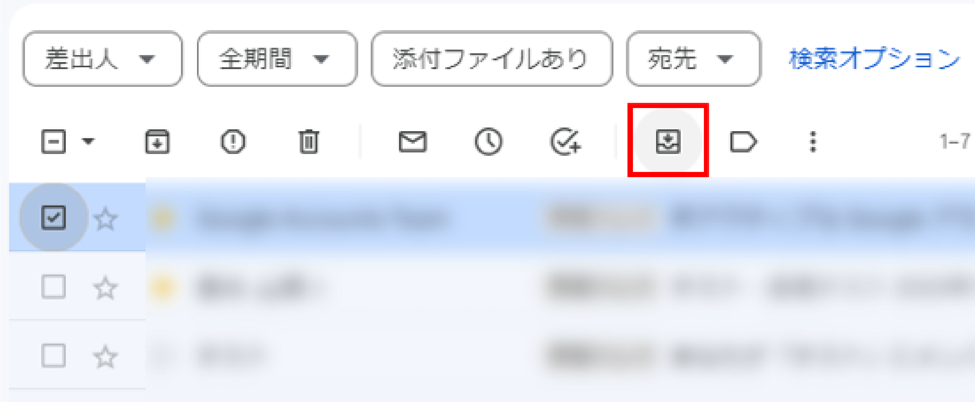 - アーカイブしたいメールのチェックボックスを選択