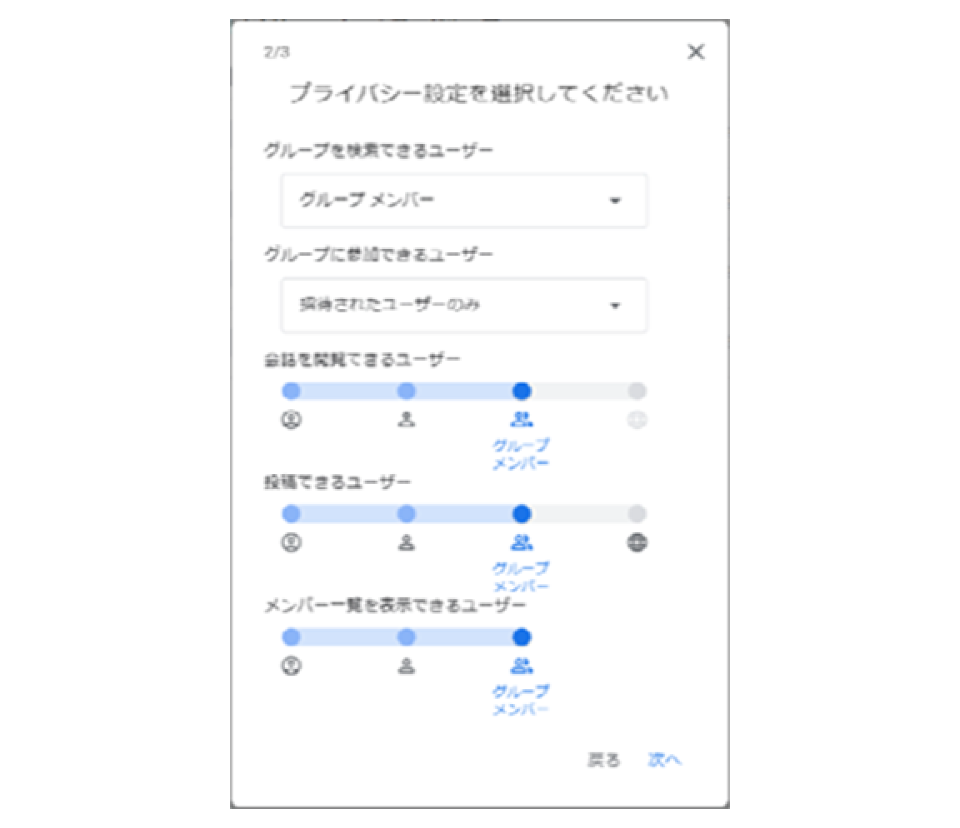 - プライバシー設定の画面が表示されたら、ユーザーごとの権限のセキュリティレベルを入力して、「次へ」をクリック