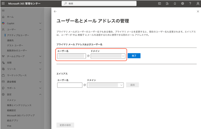 Microsoft 365初期設定で割り当てられているメールアドレスを、独自ドメインのアドレスに変更します。