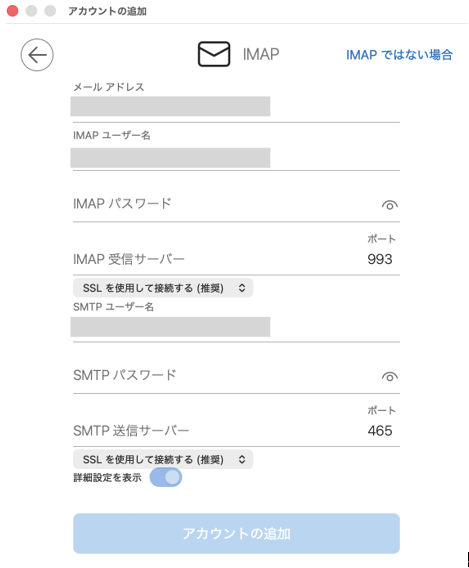 - 入力が完了したら「アカウントの追加」をクリック