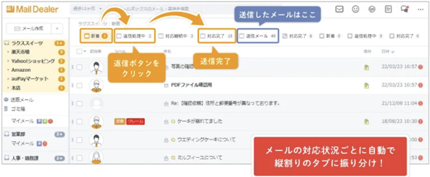 この機能の特徴は、メールの対応状況に合わせて「新着(未対応)→返信処理中→対応完了」といった専用のタブ間を自動で移動することです。手動でメールを振り分ける必要がなく、対応すべきメールを一目で確認できます。