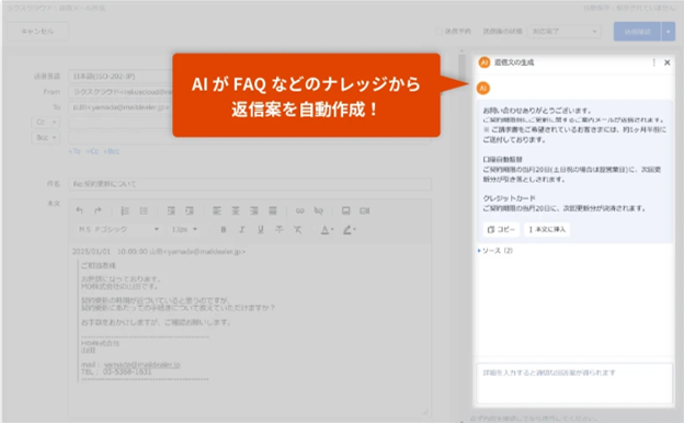 「自動生成」機能により、過去のメールやFAQを探す手間がゼロになり、返信速度が向上します。さらにベテランしか知らなかった専門的な回答も提示されるため、新人でも高品質な対応が可能になり、顧客対応の属人化を防げるのです。