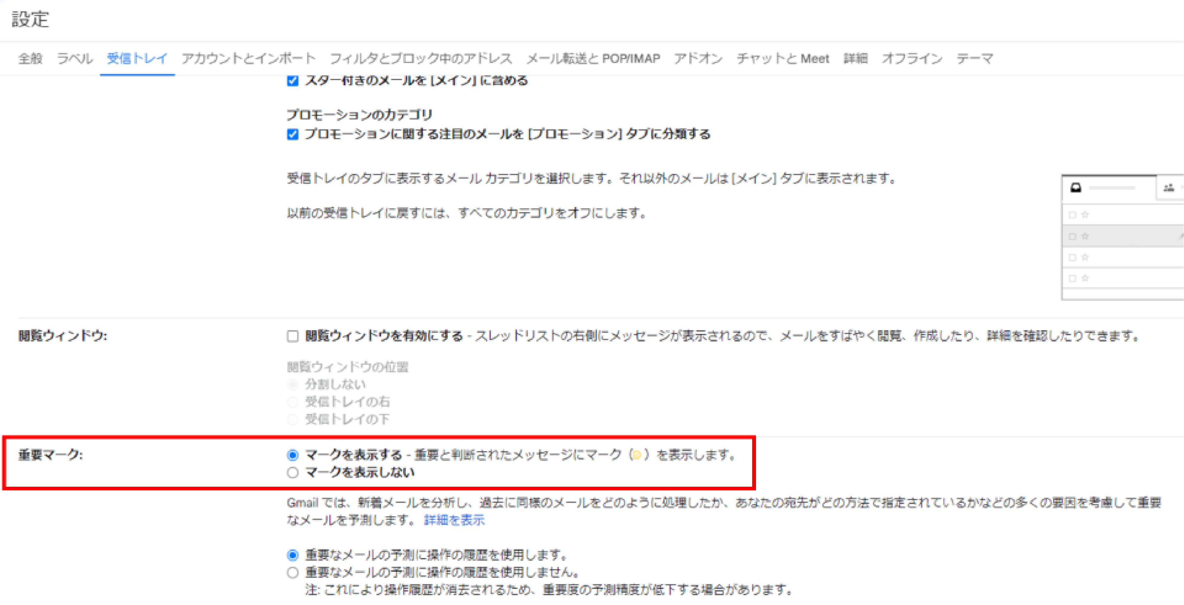 (歯車マーク)」をクリックし、「すべての設定を表示」をクリック - 「受信トレイ」タブを開き、「重要マーク」欄の「マークを表示する」にチェックをいれる