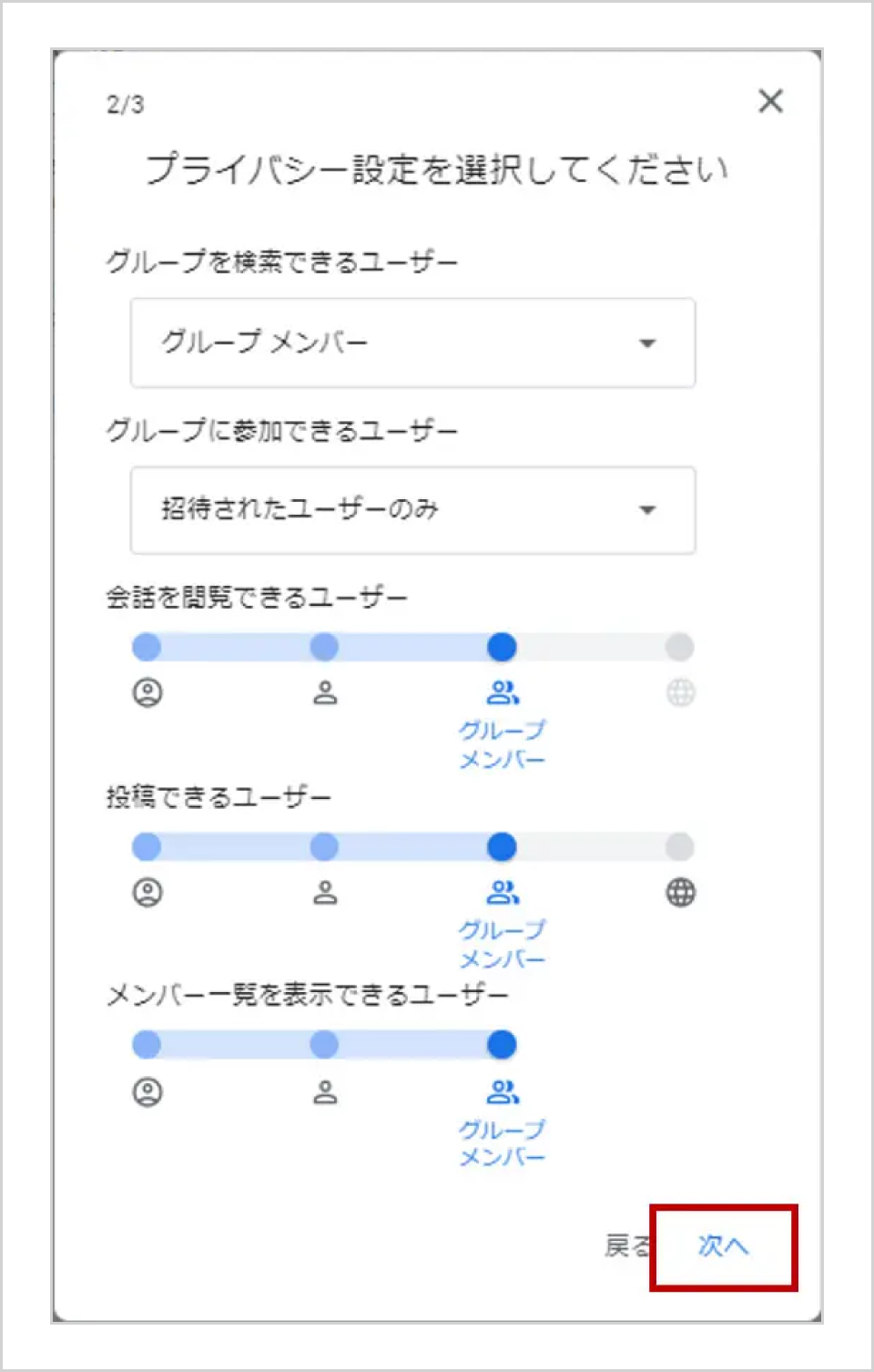 - 「グループを検索できるユーザー」を「ウェブ上すべてのユーザー」